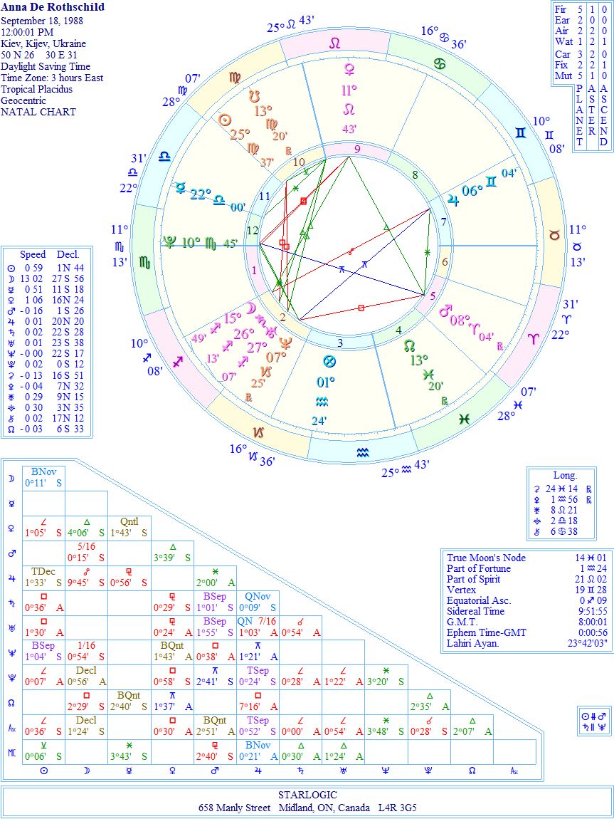 Everything about this birth chart could be fake: her name, place of birth, and time. The most consistent thing is the date of birth: September 18, 1988 on most of the identification, only once changed to September 18, 1990. But, just to see what was going on that day in Ukraine, I have erected this chart.