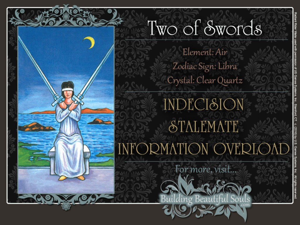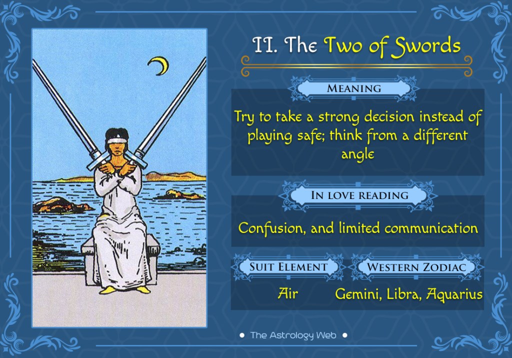 A blindfolded person sits on a stone block on the seashore, the symbolic birthplace of life. The stone seat is a symbol of solidarity. The man’s blindfolded eyes suggest he has not yet realized his situation; he is unaware that he is passing from one emotive or existential dimension to another. He holds two swords diagonally: a symbol of an apparently insurmountable boundary. In front of him is a white horse, the symbol of spiritual leadership that helps us overcome any obstacle. The beach in front of this character should be seen as a landing place for existence. In the card’s previous version, we could see the moon in the sky (representing the unconscious and instinctive faculties) and little islands in the sea (symbols of certain aspects of the personality that emerge from the unconscious).