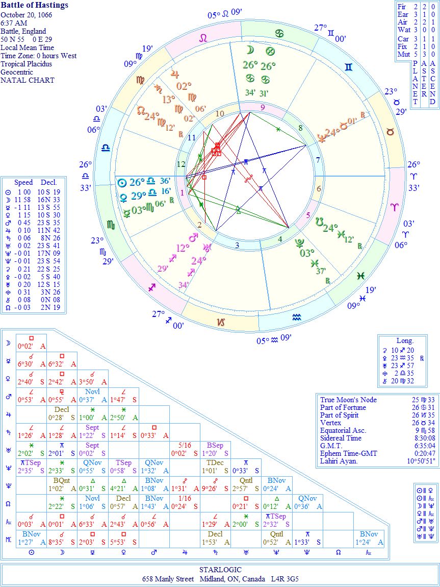 The Battle (at Battle, as the field became known) started at dawn of the day according to Britannica.com. That configuration in the centre of the event chart shows an almost complete five-pointed star. There are two interconnected Yods and one singular inconjunct.