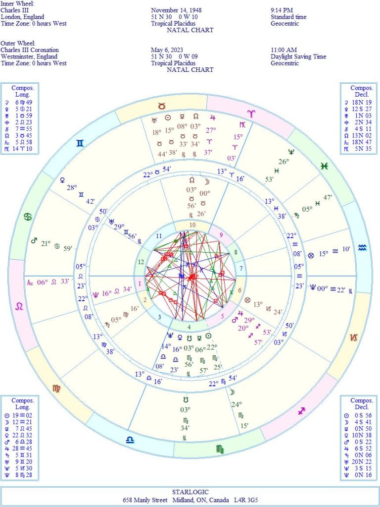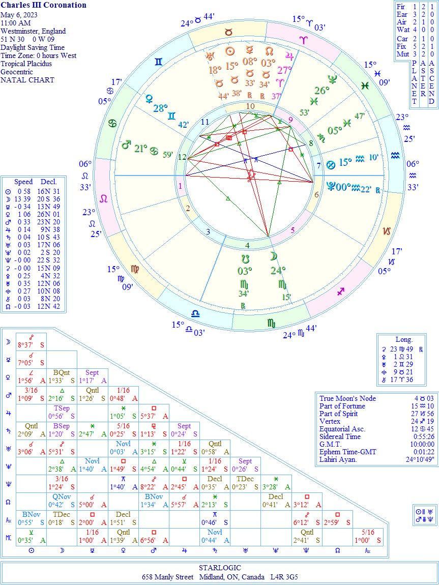 My friend David Lowe asked if I had drawn up the chart for Charles III’s coronation. At the time, I said, no and promised to do it closer to the event. Then I went and drew it up anyway, just because I was curious, too. To be honest, there wasn’t anything there to specifically worry about, as far as I could see.