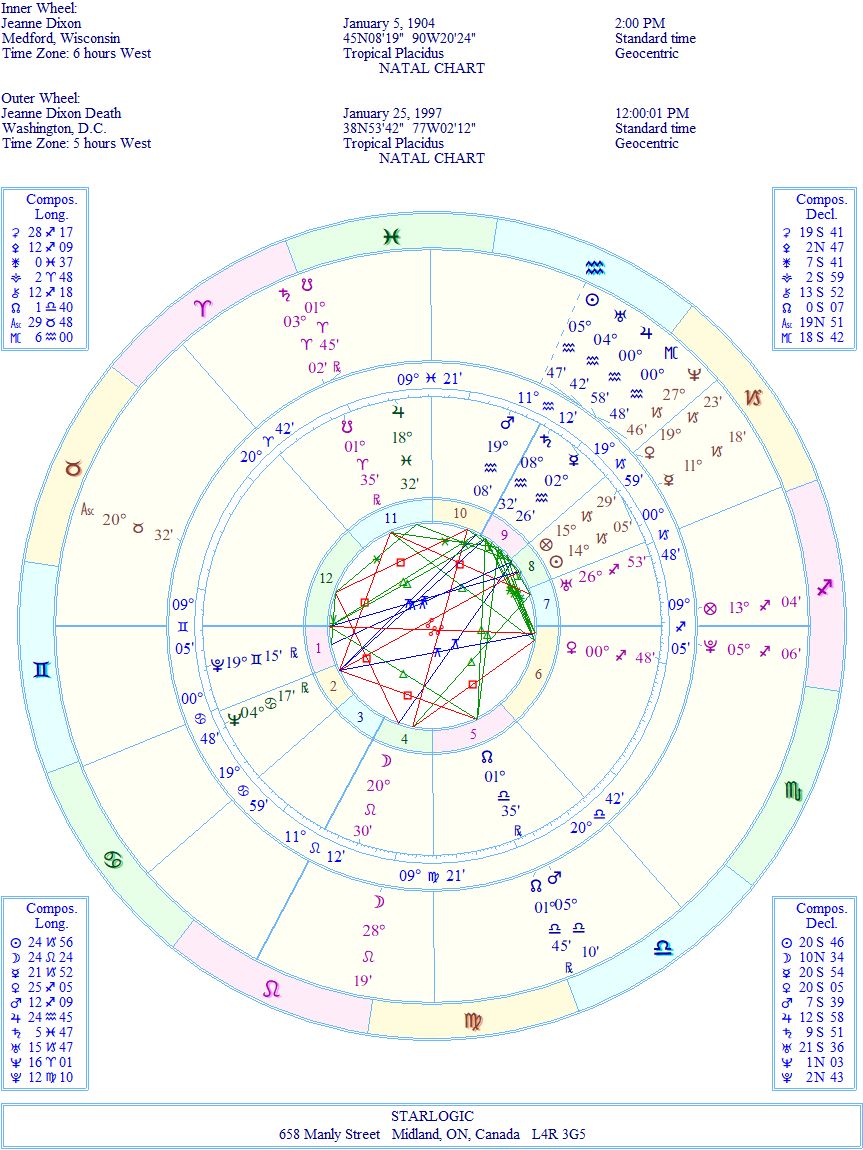 Her time of death is unreported. I have set the clock for noon, but that is inconsequential when it comes to her ‘destiny’. Note that the ‘fatal’ North and South Nodes have returned to their original natal positions. Even the ‘fatal’ Moon is about 8° from its natal position. This is a life fully lived, and finally, in the end, complete.