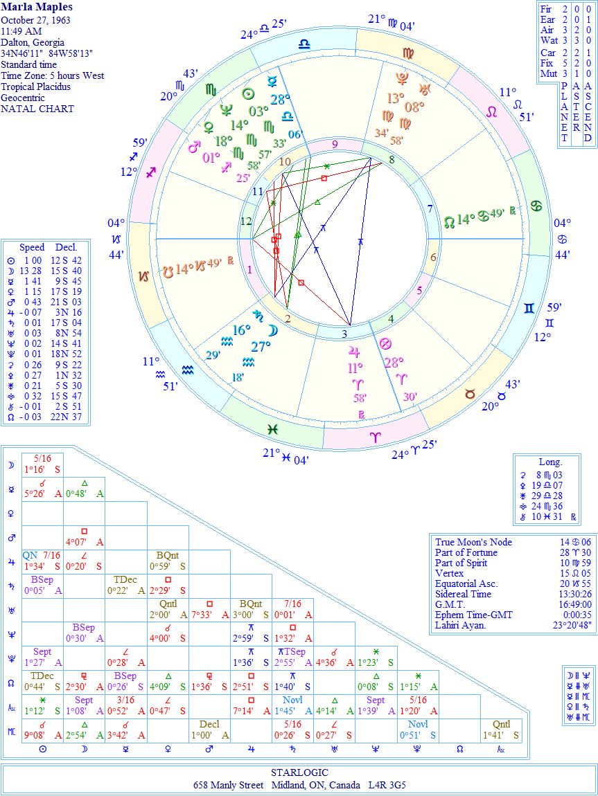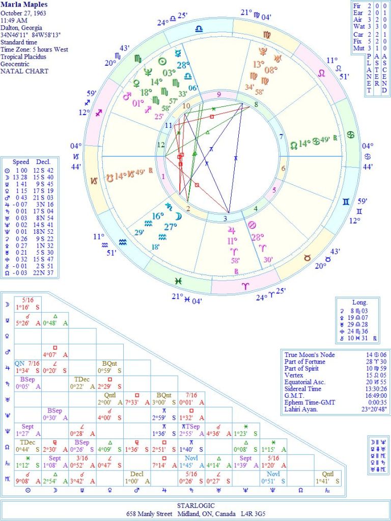It doesn’t take a genius astrologer to see that Marla was unequipped to handle Trump. Oh, sure, the attractions were there (his Venus inconjunct her Moon; her Saturn conjunct his Part of Fortune). But he was using her as eye-candy on his arm, as he sought to conquer the world.