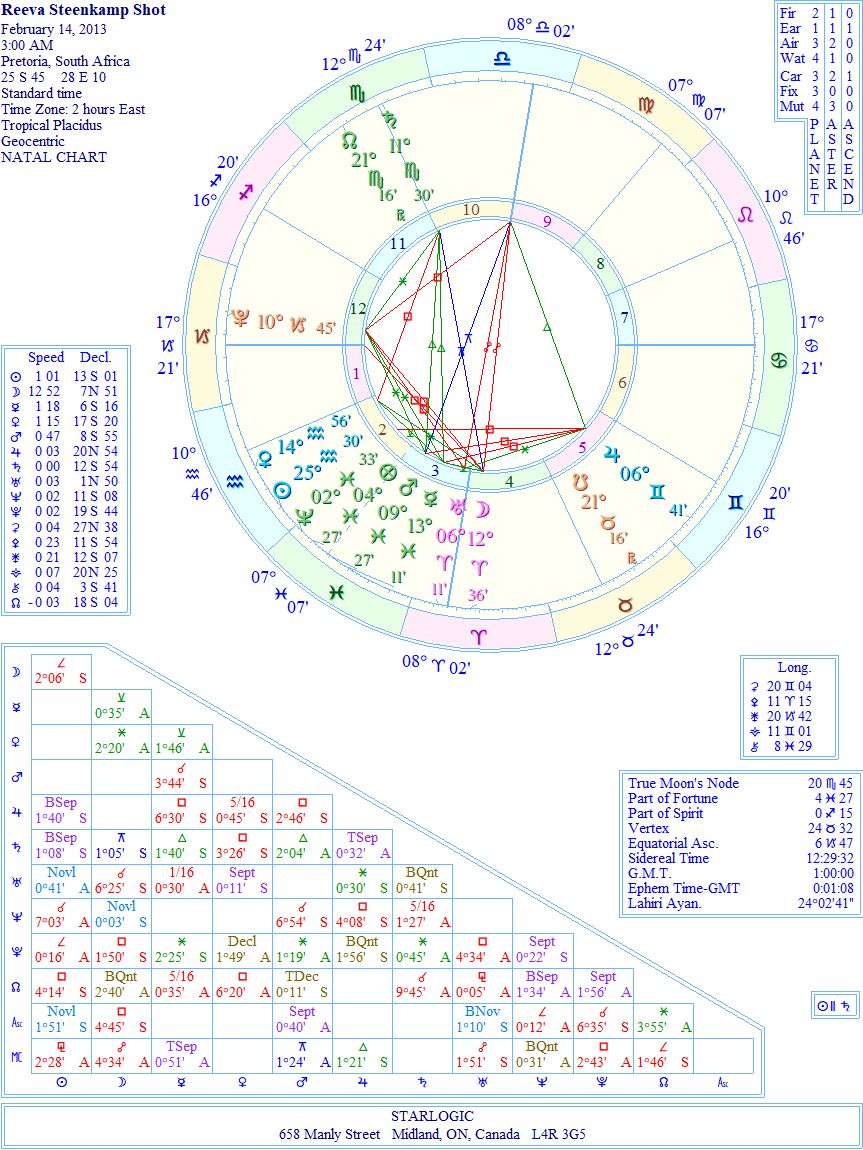 This looks to be an accurate time of death for Reeva (you’ll see why in a few moments). The two inconjuncts are the proof: Moon inconjunct Saturn; and Mars inconjunct the Midheaven.