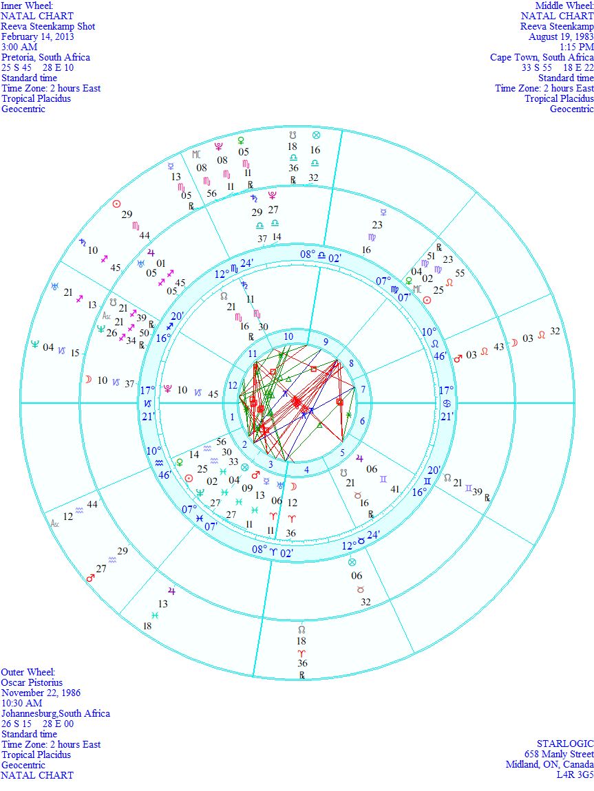 I have used the death chart as the centre of this emotional setup. Reeva’s birth chart has its Moon almost exactly conjunct the ‘event’ Pluto. Meanwhile, Oscar’s natal Moon is conjunct Reeva’s natal Mars, Oscar’s natal Uranus is conjunct Reeva’s natal Ascendant/North Node conjunction, and Oscar’s natal Ascendant is conjunct Reeva’s ‘fatal’ Venus. I wonder if this experience was predestined. It didn’t turn out well.