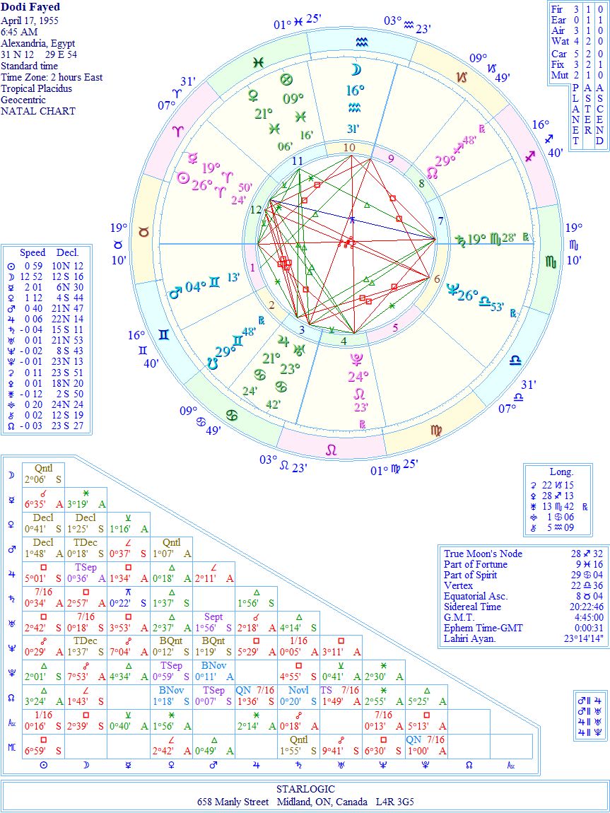 But the other incidental conjunctions between the charts speak volumes, too. Dodi’s natal Moon is linked to the accident’s Jupiter/Midheaven conjunction; and Dodi’s natal Venus is conjunct the accident’s South Node. Hmm. The title of this section is being highlighted here. According to Dodi’s (unreliable) chart, his destiny (North Node @ 29° Sagittarius 48′) should have occurred when he was 50 years of age. That’s proof that either the chart’s Ascendant is out by about 10° or so, or his destiny should have been to marry Diana. It’s an interesting puzzle.