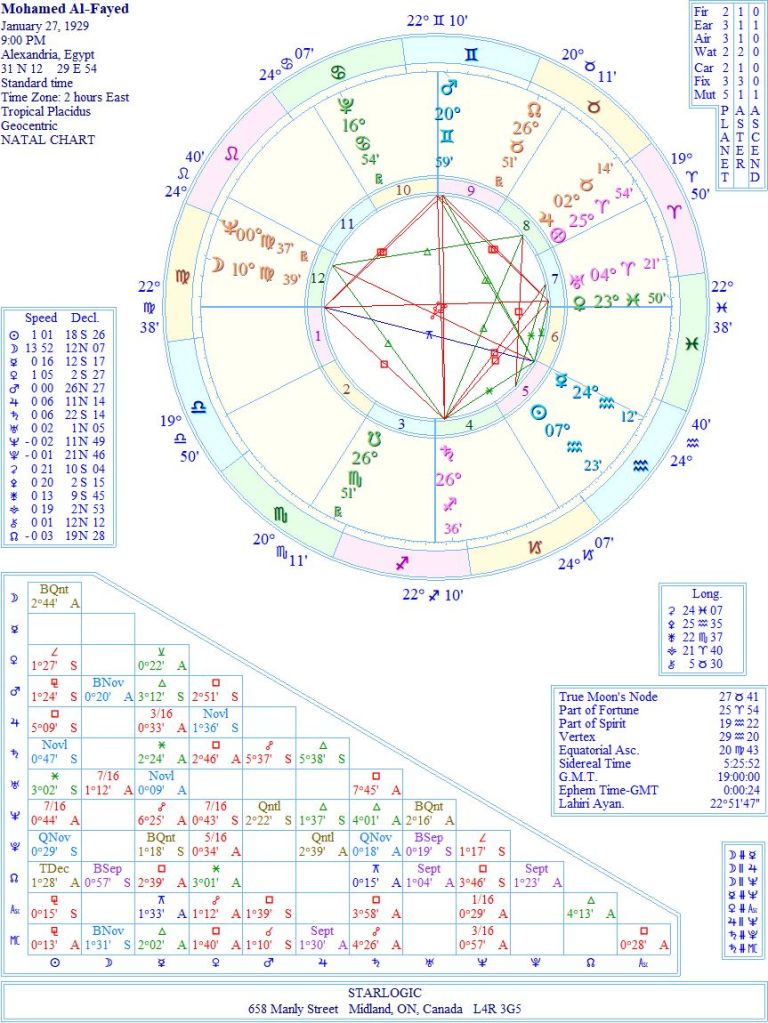 There are a couple of things about this chart that need clarifying. Al-Fayed claims to have been born in 1933, but official documents suggest that 1929 is the more accurate. I have rectified the timing to have Venus be at 25 years when he was first married to the mother of his son, Dodi. Oddly enough, that made the aspect between the Sun and the Moon exceed the degrees that would have made them inconjunct. But then, the inconjunct between Mercury and the Ascendant becomes prominent. But is it real?