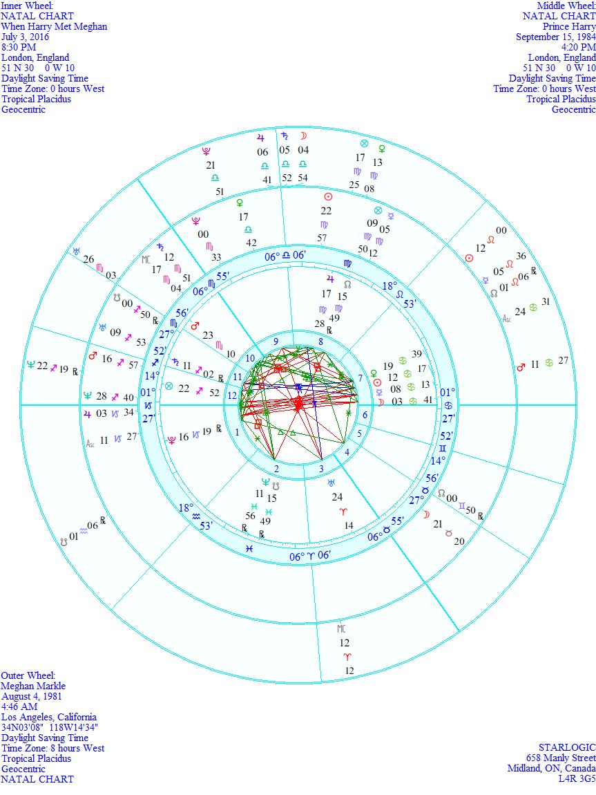 Literally, this may be half-an-hour late (just like Harry was that night), or it could be totally accurate. The point is that the Moon was on the Descendant and that may have been the trigger for them. (Think, Diana.) There are three inconjuncts, but I won’t be delineating them. Instead, I want to demonstrate how that meeting affected both of them, at the same time.