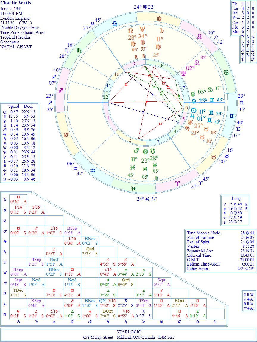The timing of Charlie’s birth chart is rectified to his marrying his wife at age 23. That places his Sun @ age 17 when he started being a professional drummer, and his Jupiter @ age 14 when he was bought his first drum kit. I think we are on fairly solid ground here. There are two inconjuncts which are time-critical because they relate to the Ascendant and the Midheaven. I will delineate them, anyway.