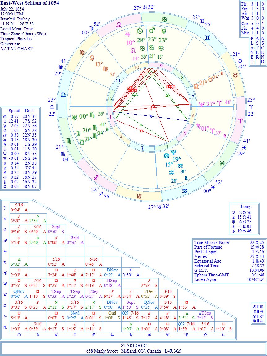 I wasn’t expecting to see such a visible ‘schism’ dynamic. The T-squares formed by the Sun/Mercury/Mars/Midheaven in Cancer with Neptune in Aries and the Ascendant in Libra (conjunct to Uranus in Scorpio) show the tensions of the day @ noon. I don’t known exactly when the excommunications took place, but this chart gives a fair hint. It took until the 20th century to heal some of the wounds inflicted on the day. There is but one inconjunct.