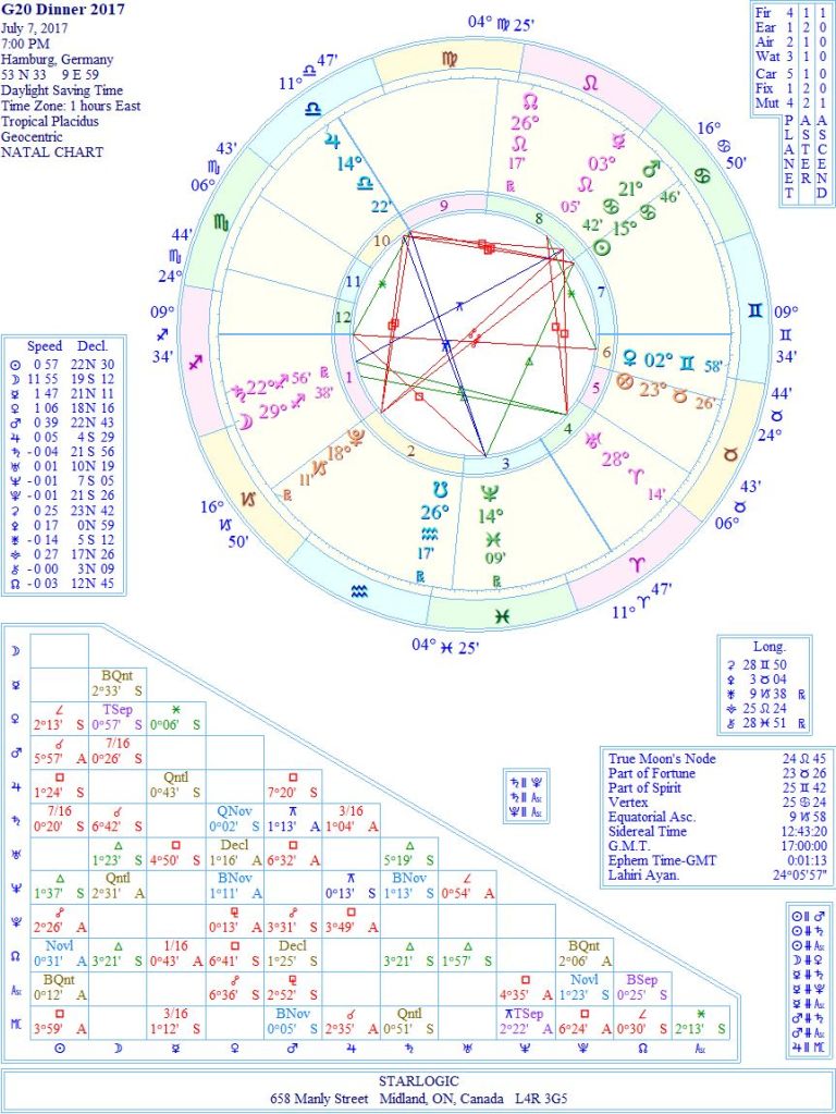 With Melania’s South Node being almost exactly conjunct Putin’s Part of Fortune, I would lay odds that they’ve been in each other’s lives in the past. The clincher to me? The event Moon is conjunct Melania’s Moon which is conjunct Putin’s Mars. Hmm. Have we hints here of the tumultuous relationship between Cleopatra and Julius Caesar? That is something I need to explore more fully, but at a later date.