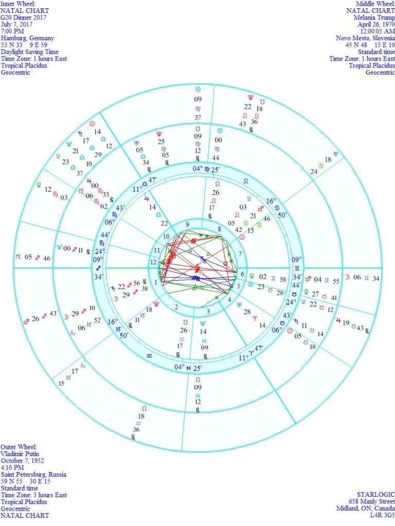 I was originally only going to compare Putin’s and Melania’s charts, which told an interesting story on their own, but decided to see the whole picture by including their first meeting. Remember what I said before about Melania’s marriage to the Donald as a mismatch made in hell? This one seems the opposite: Putin’s Moon is conjunct Melania’s Mars and the event’s Venus. Oh, boy. Something was up.