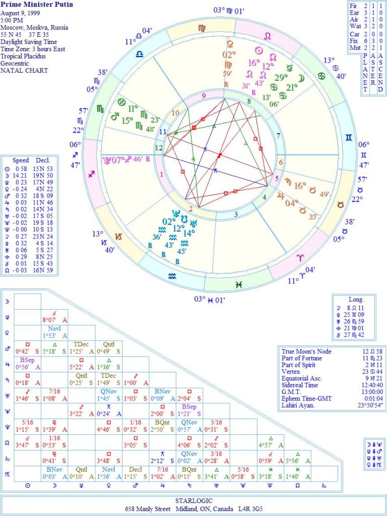 By itself, this day should have raised some concerns for the rest of the world, but, as always, hindsight alone is 20/20 vision. That Pluto/Ascendant conjunction @ 6°-7° Sagittarius was an indication of Putin’s future plans of world domination. He couldn’t do it alone; he needed Boris Yeltsin‘s help to get there.