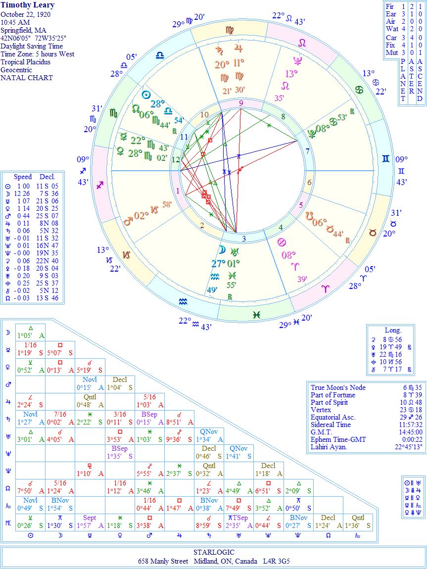 All the inconjuncts of this birth chart are time sensitive. Because this chart was already on my computer, I’m going to take it as read that it’s correct for the timing of Timothy Leary‘s birth.