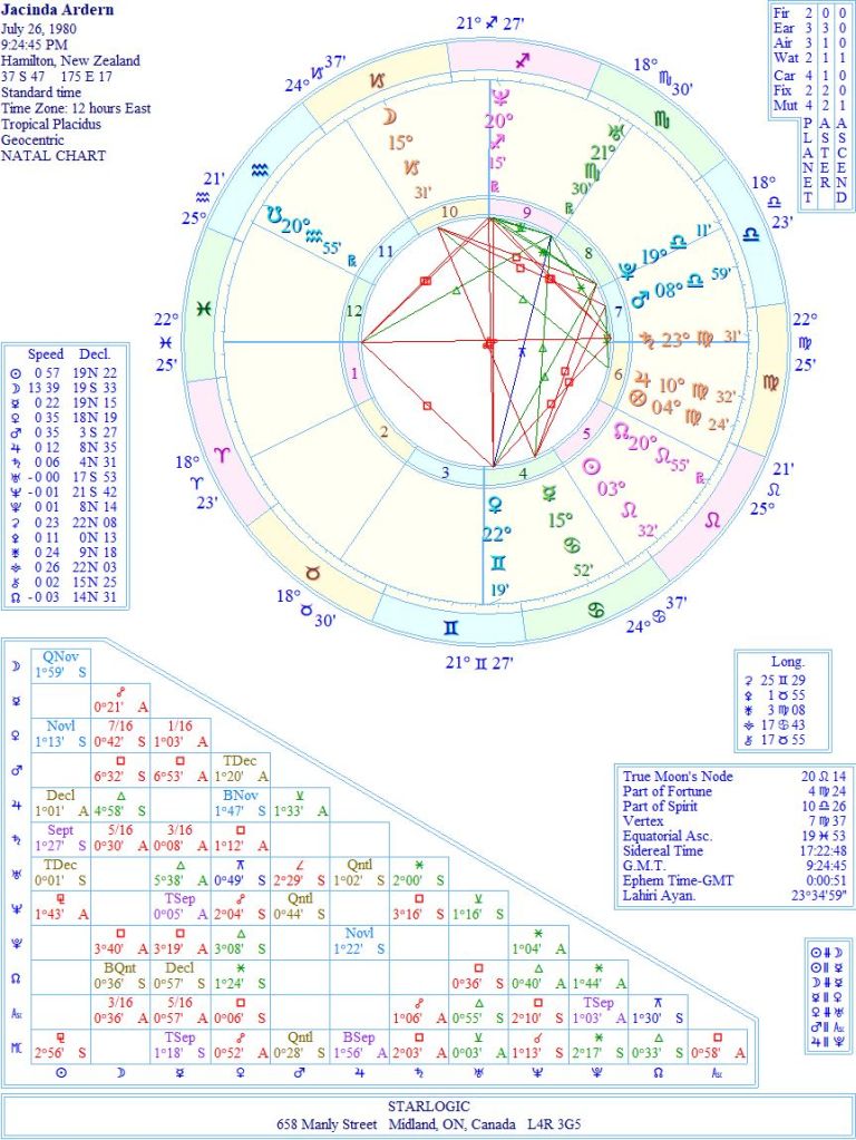 This is a randomized birth time, flipped from AM to PM. My reason? I wanted to highlight the timing of her election as Prime Minister @ 37 (Mars), and her resignation @ 42 (Pluto). To my mind, Pisces Ascendant in opposition to Saturn in Virgo perfectly describes how she appears to the world. Soft, but tough. There is only one inconjunct, not dependent on a correct birth time.