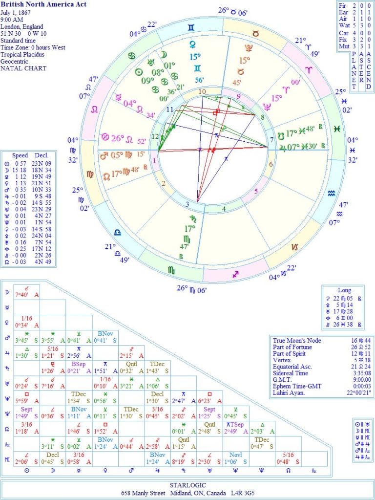 Canada has a Yod pointing at Saturn @ 17° Scorpio 47′. The inconjuncts come from Venus @ 15° Gemini 56′ and Neptune @ 15° Aries. There is another inconjunct connecting Mercury and Jupiter. These are independent of an exact birth time. Hmm.