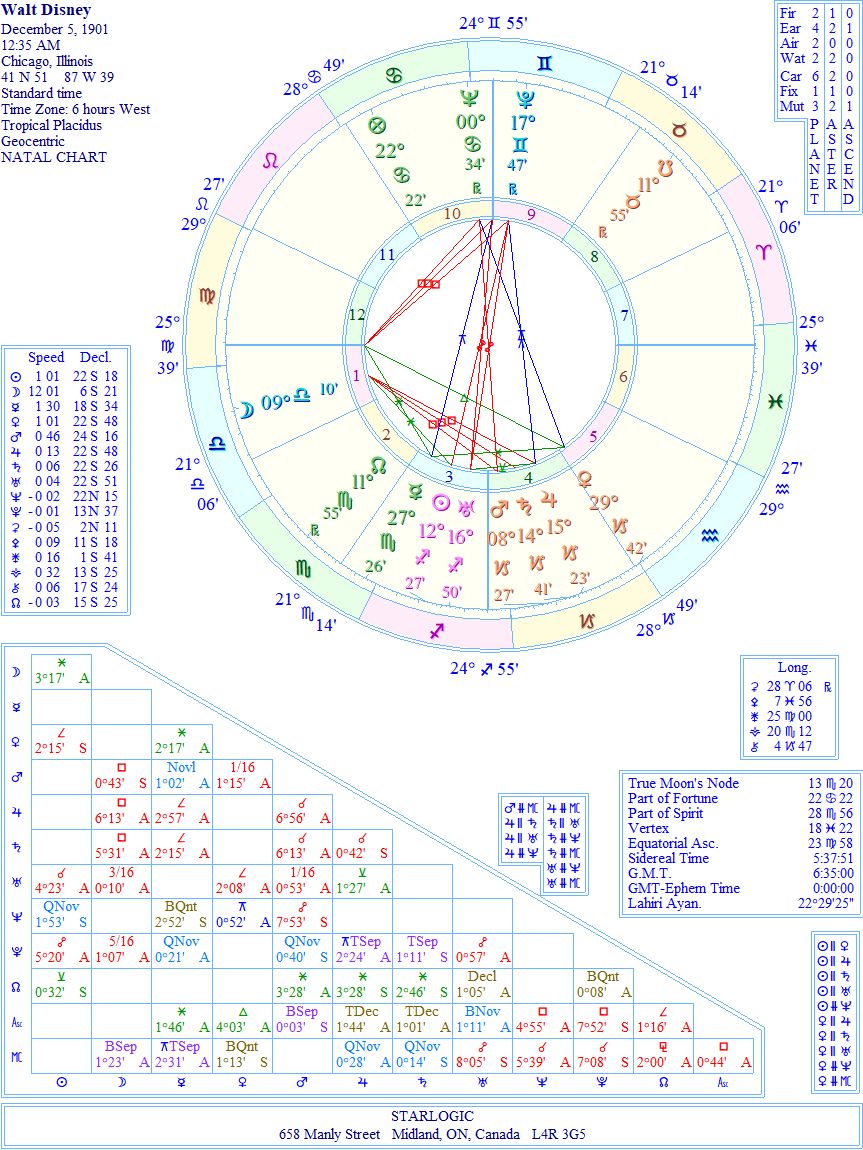 The timing of this chart was already on my computer, with the note that it came from his birth certificate. I didn’t know they were that precise in Chicago in 1901. However, Walt thought he might have been adopted, and a 1st House Moon would seem to confirm that idea. There are three inconjuncts.