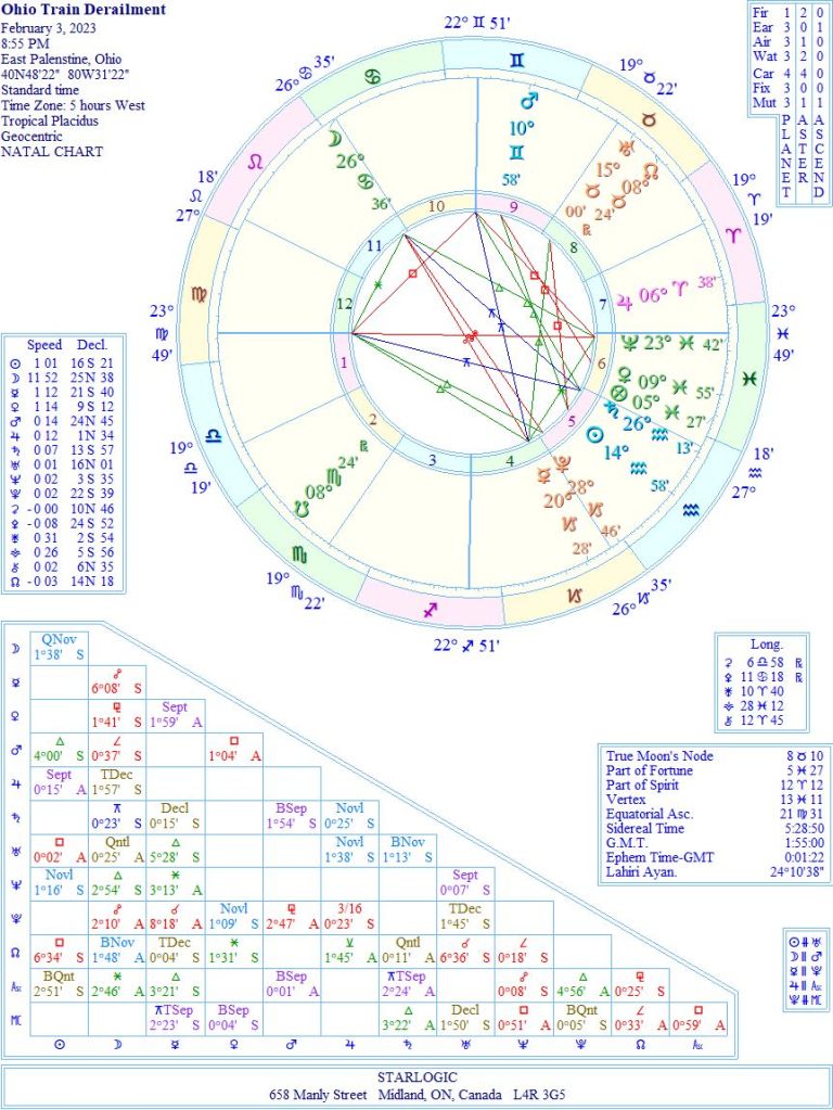 According to news reports (and Wikipedia), this is the precise moment that the train derailed. My reason for charting it is (obviously) to see if there are any hidden agendas. Turns out there are three inconjuncts, two of which form a Yod pointing at Saturn. That’s interesting.