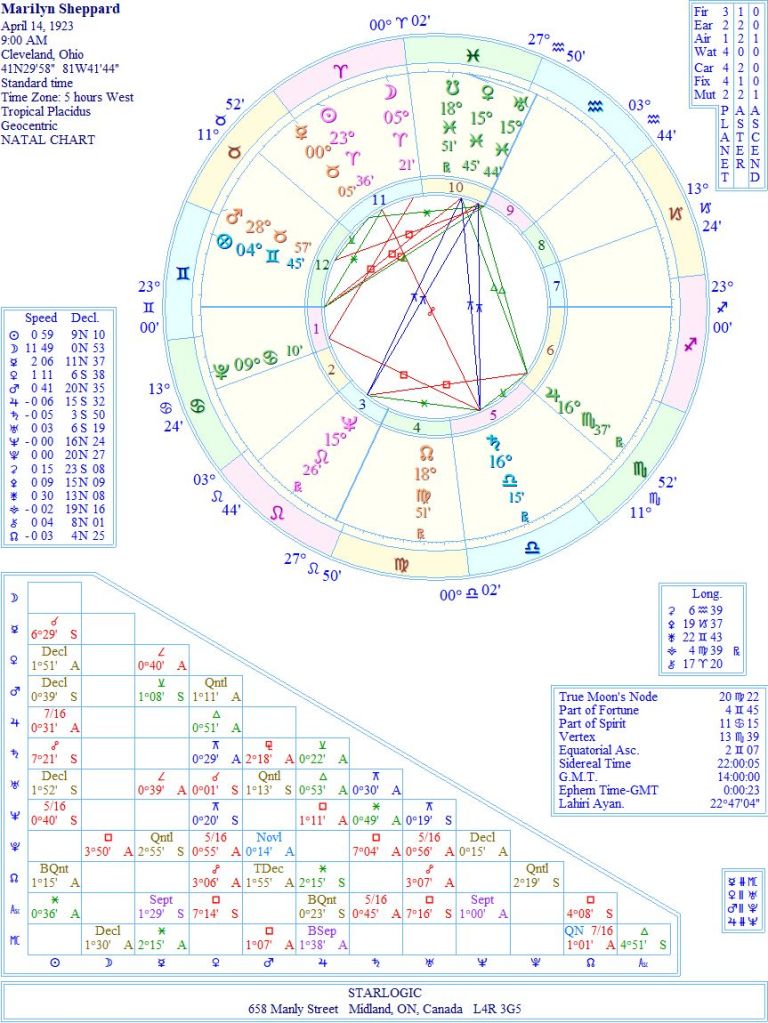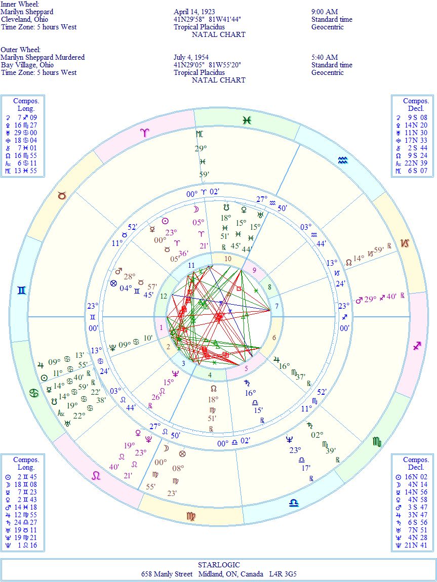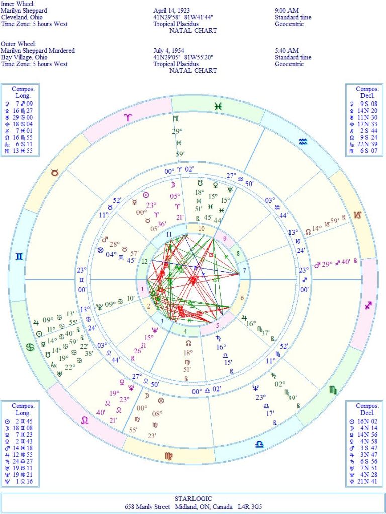 This birth time is considered excellent. Now, it echoes her murder chart by showing a double Yod pointing at her natal Venus/Uranus conjunction, formed by inconjuncts to Saturn and Neptune. That’s disturbing, on its own. But was she caught ‘in flagrante delicto’? Or was she the victim of a home invasion gone wrong? Here are her birth and death charts combined.
