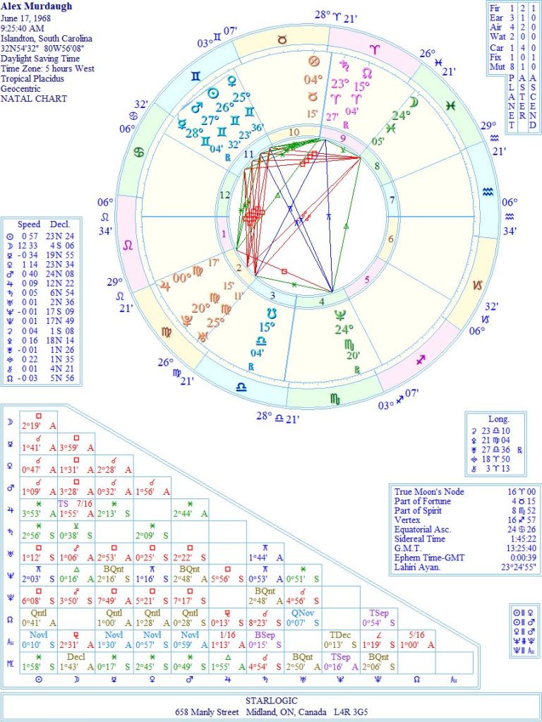 Okay. The birth details for Alex Murdaugh may be incorrect: his son, Buster, on the witness stand could not remember when his dad’s birthday was. He suggested June 27th, usually celebrated on Memorial Day (July 1st). Alex nodded that this was correct. So, his birth chart might actually be ‘wrong’.