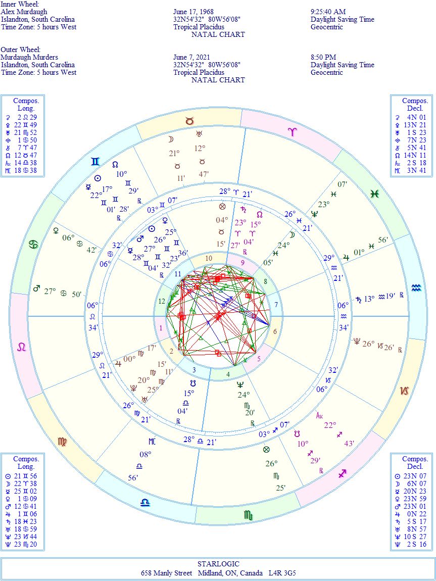 Okay. The birth details for Alex Murdaugh may be incorrect: his son, Buster, on the witness stand could not remember when his dad’s birthday was. He suggested June 27th, usually celebrated on Memorial Day (July 1st). Alex nodded that this was correct. So, his birth chart might actually be ‘wrong’.