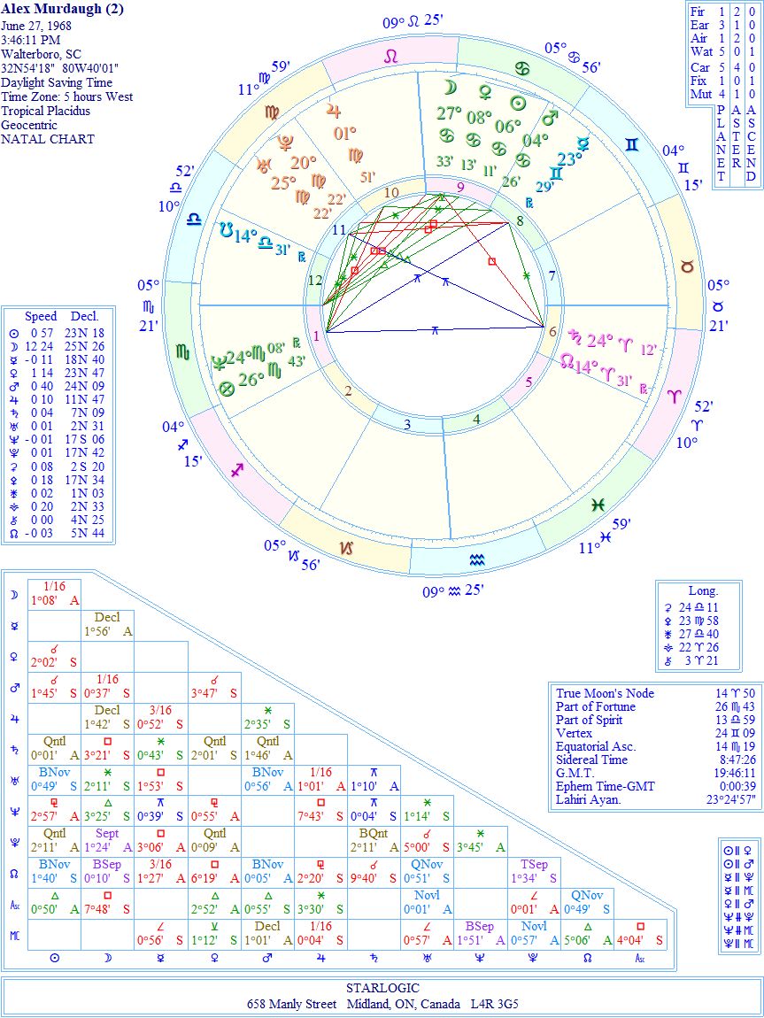 Due to the fact that Alex’ son, Buster, (finally) identified his father’s birth day as June 27th, I’ve done a second birth chart that highlights this change. To further complicate it, I’ve randomized the time to now.
