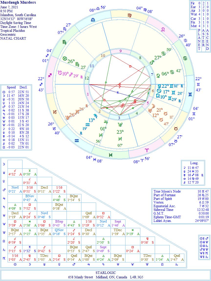 Alex’ natal Moon is now almost exactly conjunct the event Mars. Hmm. The event Venus is conjunct Alex’ natal Sun, while both charts’ Mercury are retrograde @ 22° – 23° in Gemini. Both charts’ Part of Fortune are conjunct @ 26° Scorpio. And because the event Pluto is opposite the event Mars/Alex’ Moon conjunction, I suspect we have a ‘slam dunk’ guilty situation.