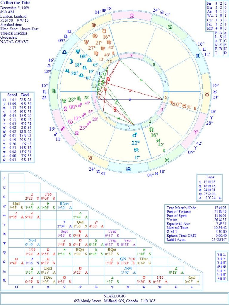 The date of Catherine Tate‘s birth is usually written wrong: May 12, 1968. That’s probably because of the differences in the way dates are written in the US and the UK. Day, month, year in one country was inverted to month, day, year in the other. But even Wikipedia needed correcting, because they had the year wrong, too. However, Ms. Tate’s birth time has been rectified (from an estimated time) by someone else, and I’m not exactly sure what his criteria was for doing so. Nevertheless, I agree with the result.