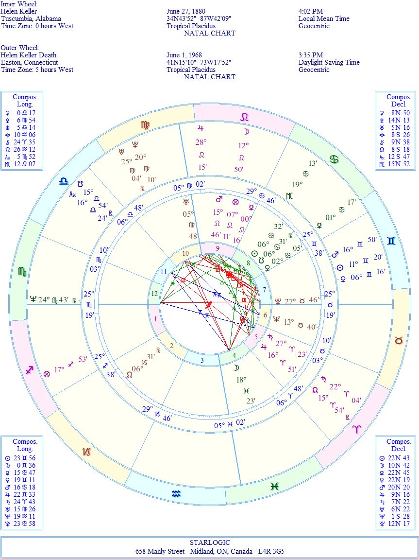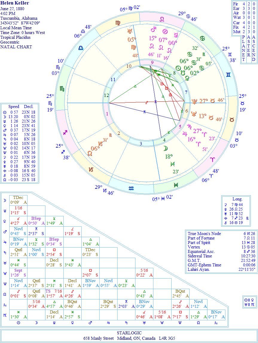 The North Node in a 2nd House Capricorn is tied to her being one year of age. Her life’s purpose may have been caused by the scarlet fever that blinded her @ 19 months. The very next ‘event’ in her life is represented by the Moon in a 4th House Pisces at about 6 years. This is when Annie Sullivan came into her life. That Moon is connected to Mars by an inconjunct. There is also an inconjunct connecting Saturn and the Ascendant.