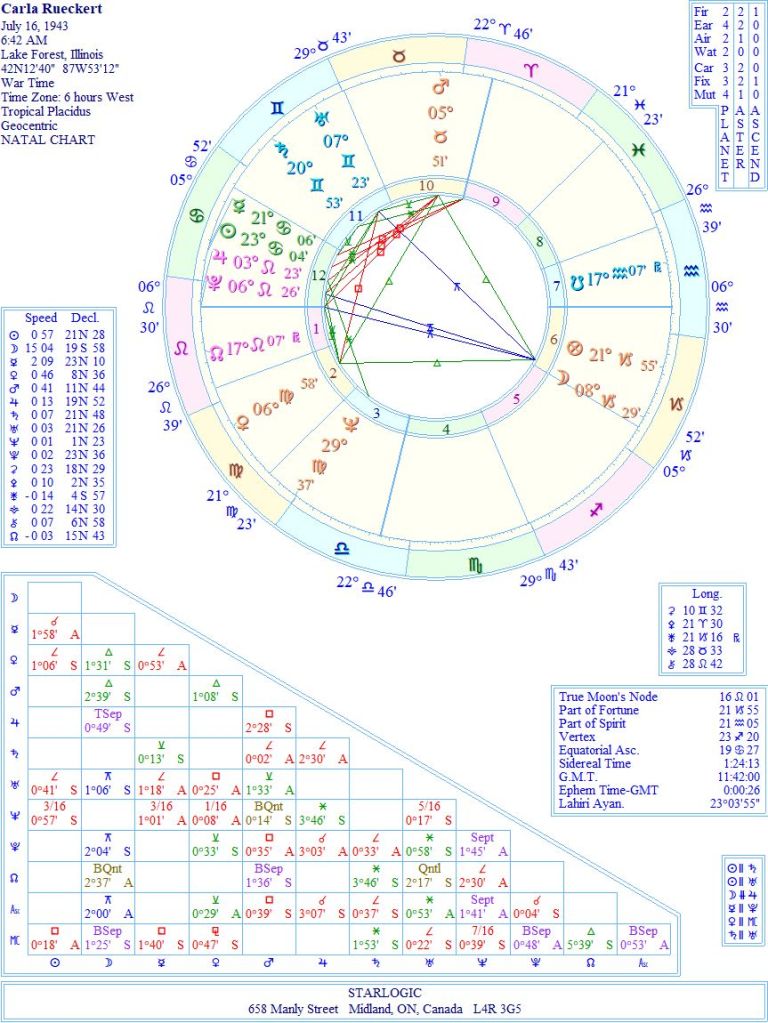 I have yet to find how this birth time was discovered. I suspect it was anchored with Pluto transiting the Leo Ascendant @ 6°. There is but one (and yet doubled) Yod, pointing at the Moon. Hmm.