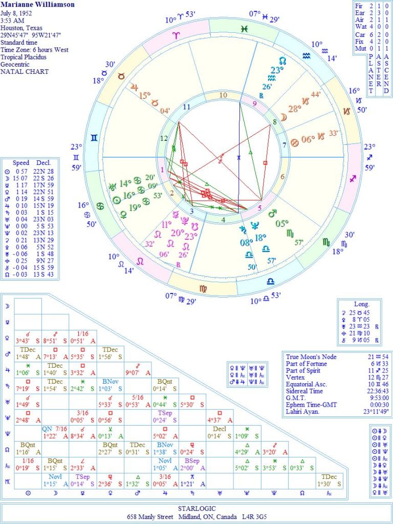 The Sun/Venus/Uranus conjunction in Cancer tells us so much, especially as the Moon is in the opposite sign of Capricorn. She may seem soft inside, but at her core she is a hardened activist for political change. There is one inconjunct.