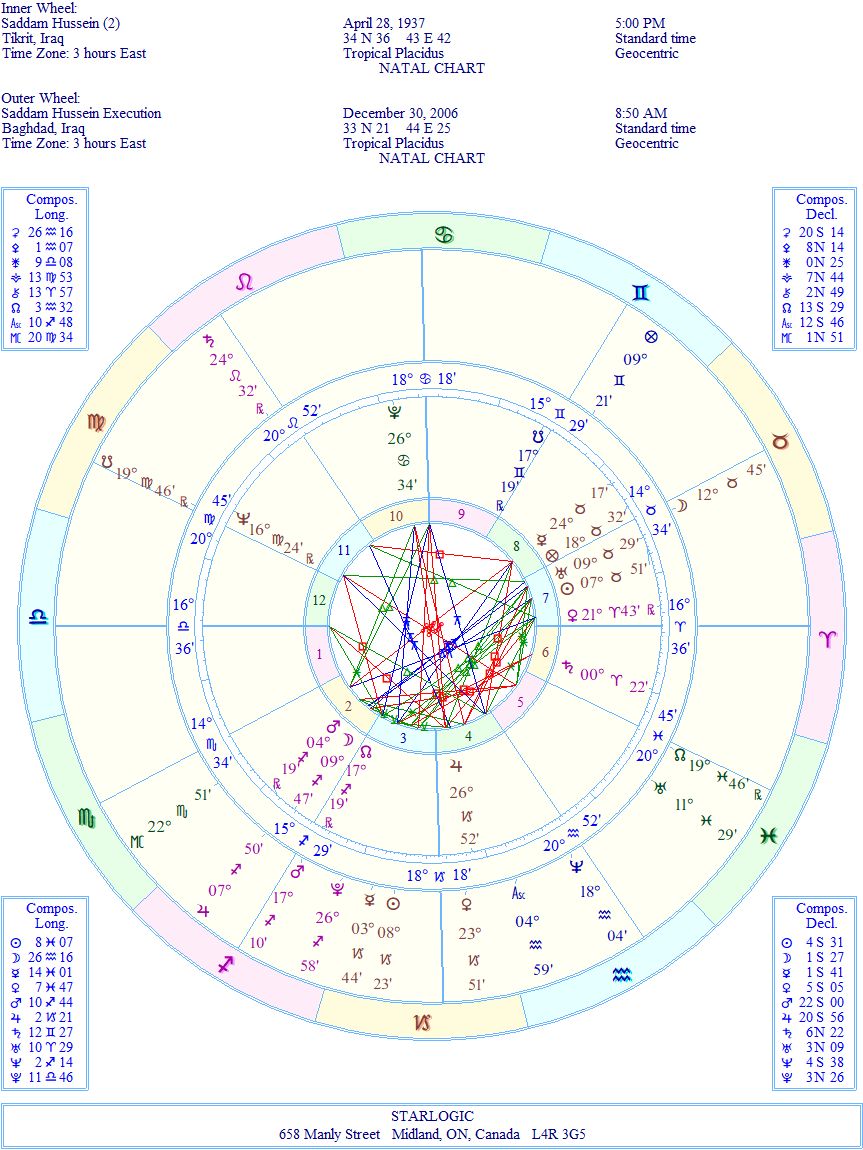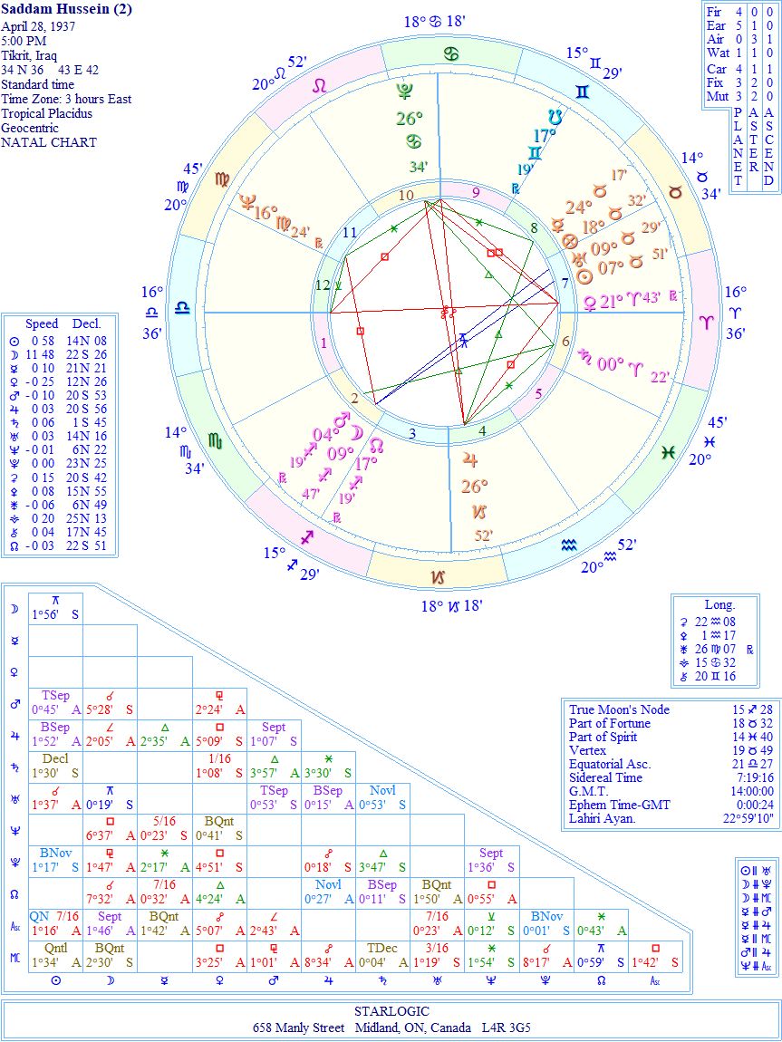Most websites (and my computer program) have his birth time set @ 4:00 am (local time). His son happened to mention once that his father was born @ 5:00 pm (local time), so I’m going to buck the trend and work with that time. That Libra Ascendant may seem to make a mockery of his dictatorship, but I suspect that’s why he spent so much time trying to control his country, by any means possible. He also wanted to be known for being the 3rd most important Arab leader, after Saladin and Mohammed.