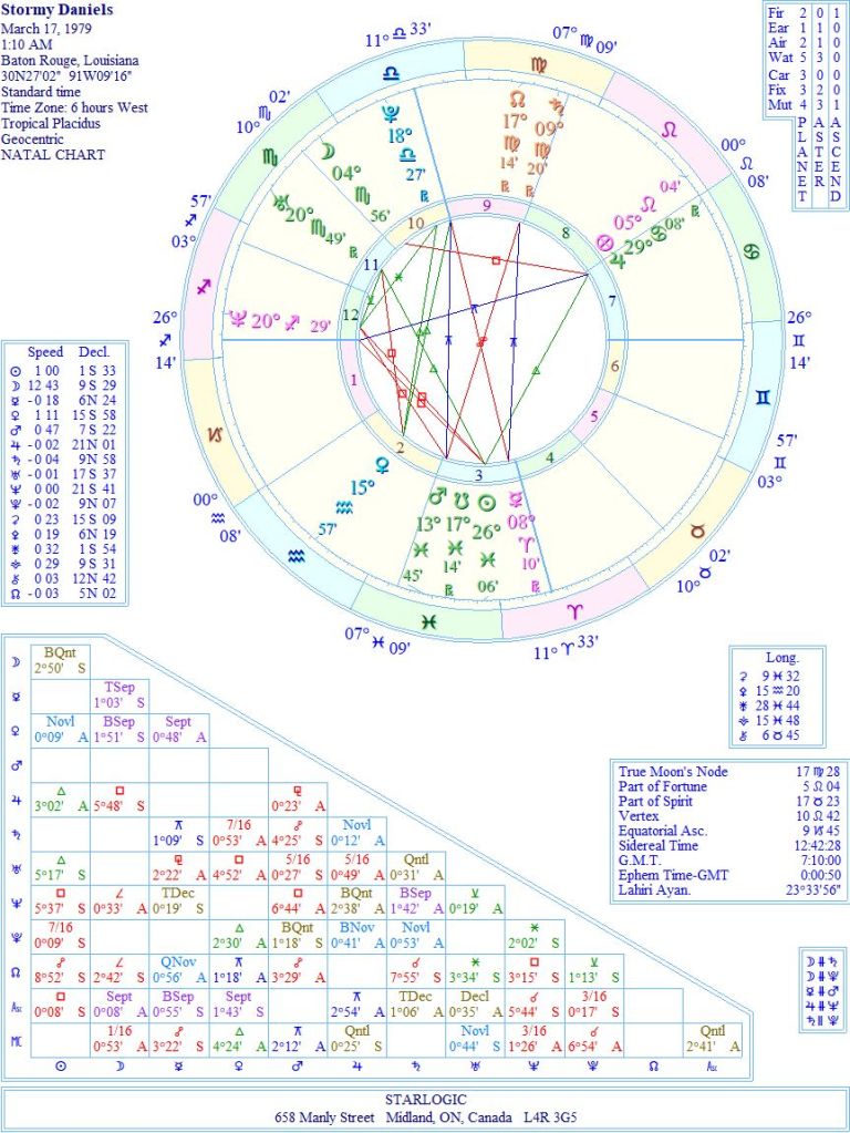 Remember what I said about a Neptune/Ascendant conjunction woman? This is a porn actress. It’s good to keep that in mind. But, if Cohen is to be believed, Donald Trump felt threatened enough about exposure before the 2016 Presidential election, he ‘authorized’ Cohen to make a $130K payment (from Cohen’s own account) and then reimbursed him as ‘legal services’. Where there’s smoke, there’s fire? Perhaps.