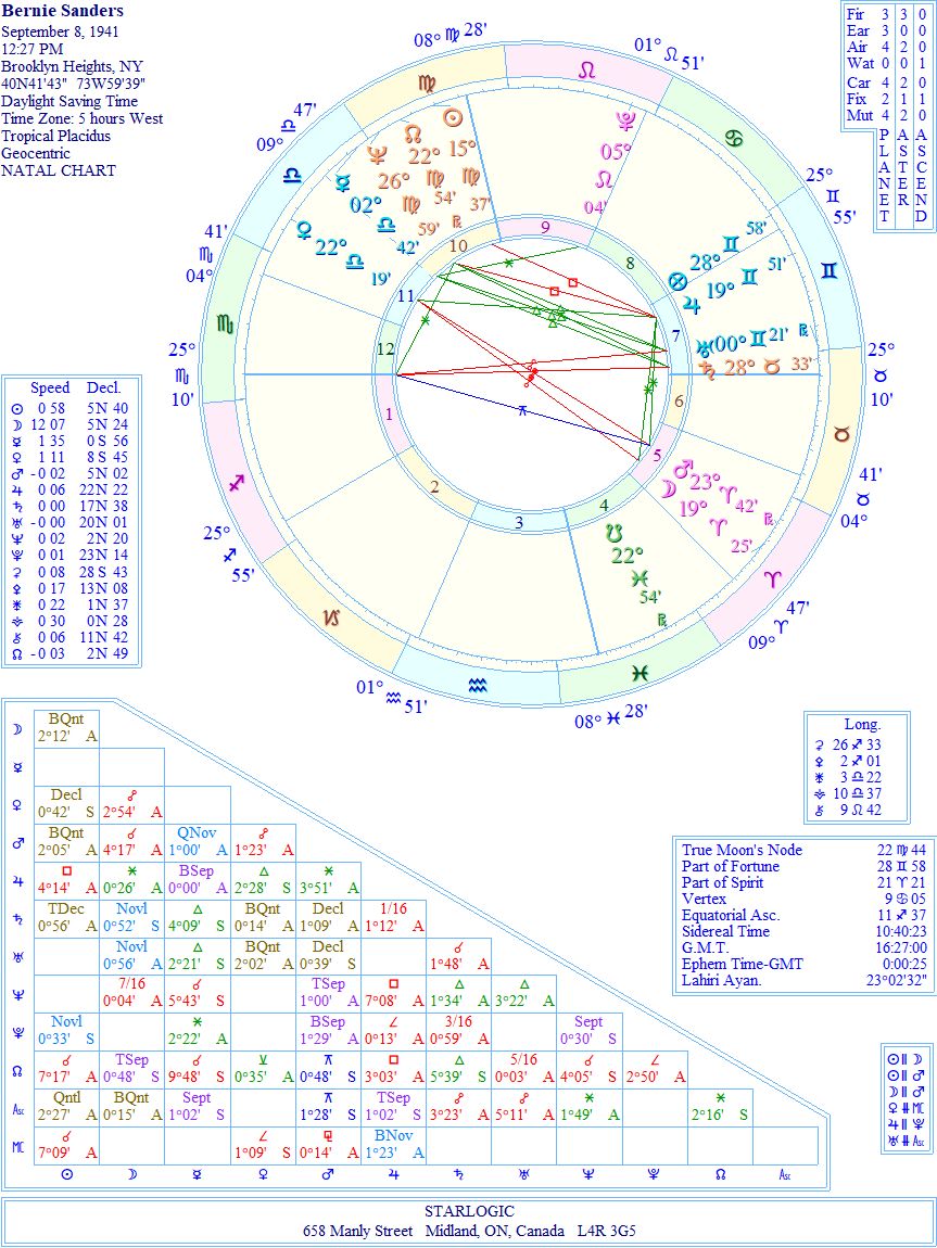 This chart was already on my computer program, and seems to agree with other astrology sites. However, the source of the timing is not known, so it might be wrong. He says he became interested in politics at a young age and the Moon/Mars conjunction in a 5th House Aries may be proof of that. Pluto and Chiron are within 5° of each other in Leo (near his 9th House cusp), which may indicate that he feels driven to heal something from the past. His North Node is midway between the Sun and Neptune in a 10th House Virgo, which might mean that he’s trying to get to the absolute truth of politics, but keeps coming up against nefarious forces. Saturn and Uranus are conjunct his Descendant Taurus, so it would be difficult to change his mind. There is one inconjunct.