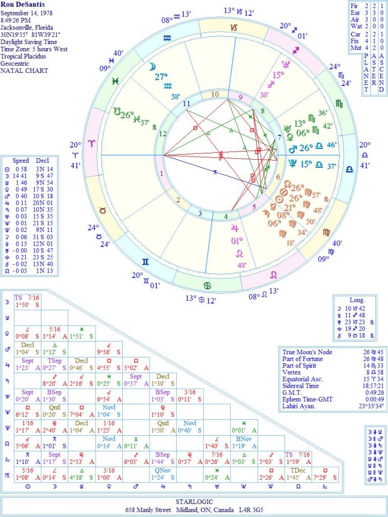 DeSantis’ birth time is not known, therefore I randomized the timing and then flipped it from AM to PM, so that Venus would appear at about 31 years of age, when he married his wife. It looks about right.
