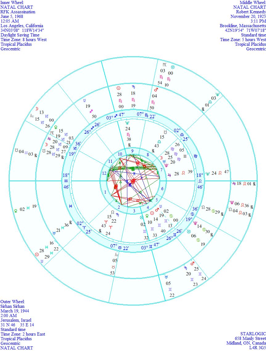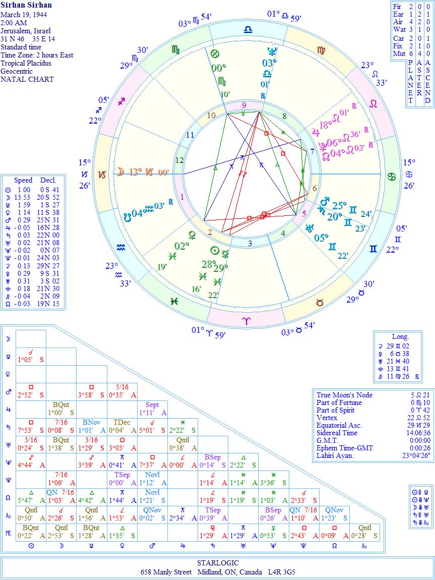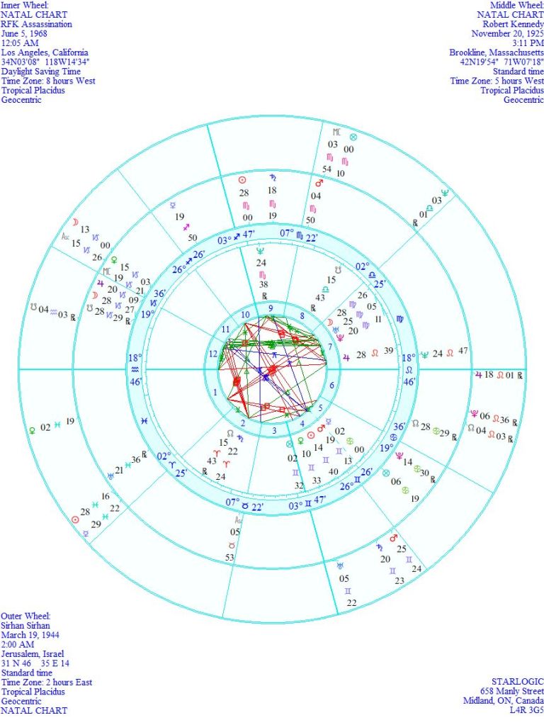 In my book “At This Point in Time” I looked at Robert F. Kennedy’s assassination. My ‘guess’ at the time was that J. Edgar Hoover might have had something to do with it. But I never looked at Sirhan Sirhan until today. This was prompted by a forensic astrology video on YouTube from my friend, Ellie Adams and her fellow astrologer, Brandy Burrow. I hope this will help solve the mystery.