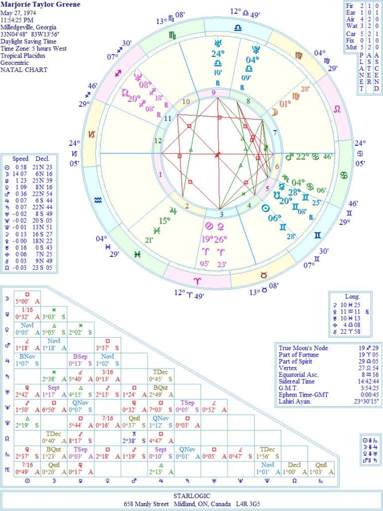 Astrotheme.com is the only astrology website to tackle MTG’s birth chart. Because her birth time is unknown, they set the clock for 12 noon. Only problem is the chart actually shows 12 midnight instead. Is this a case of the Universe correcting an oversight?