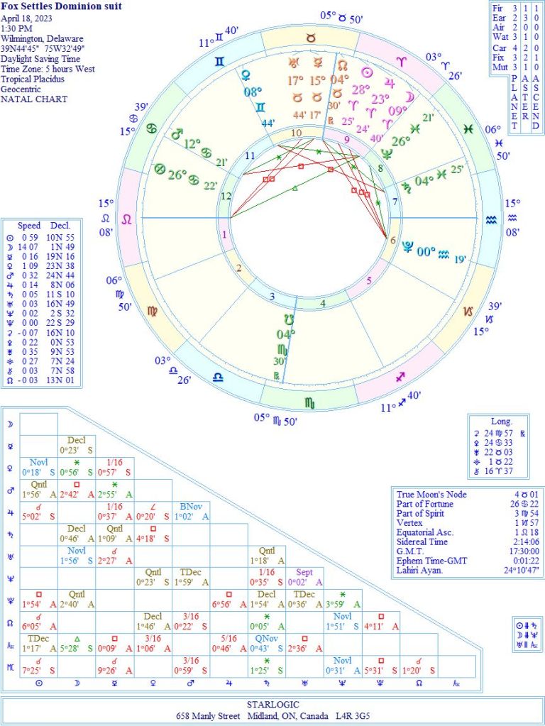 I hadn’t realized that I had the chart for Fox stock IPO on my computer, so comparing this chart and the lawsuit chart shows a very interesting connection: Saturn in the IPO chart is conjunct the event Sun @ 28° Aries, while Neptune in the IPO chart is conjunct the event Pluto @ 0° Aquarius. Evidently, the whole process of the legal discovery occurred while Pluto was transiting that IPO Neptune: hidden matters being exposed to the light of consciousness. Isn’t astrology grand?