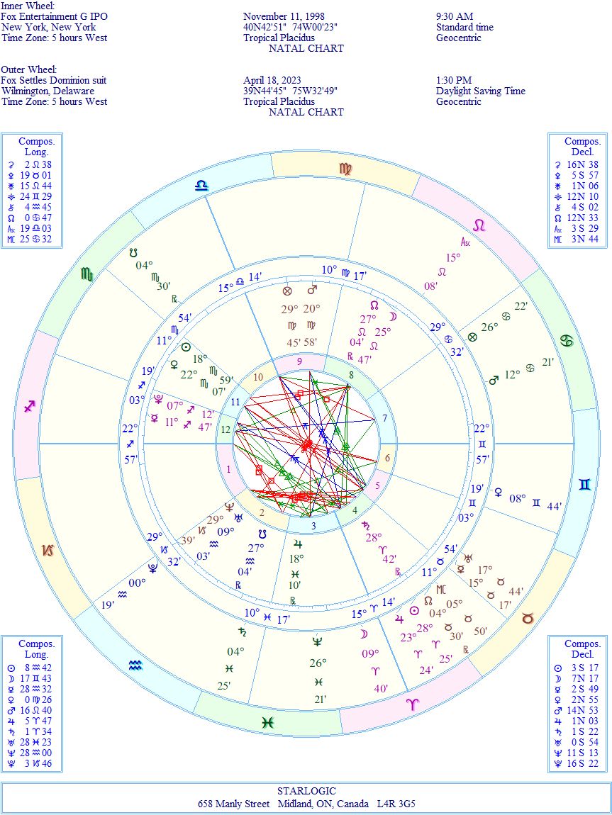 I hadn’t realized that I had the chart for Fox stock IPO on my computer, so comparing this chart and the lawsuit chart shows a very interesting connection: Saturn in the IPO chart is conjunct the event Sun @ 28° Aries, while Neptune in the IPO chart is conjunct the event Pluto @ 0° Aquarius. Evidently, the whole process of the legal discovery occurred while Pluto was transiting that IPO Neptune: hidden matters being exposed to the light of consciousness. Isn’t astrology grand?