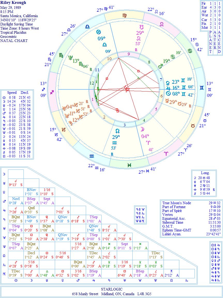As there are no inconjuncts, what you see is definitely what you get with this young lady. As proof, see that Ascendant of hers @ 13° Sagittarius 9′. She is another one of those straight-shooters, but her personal energies are held in place by some oppositions and squares. Her acting chops come from Saturn/Neptune conjunction in Capricorn. She mentioned in one interview I saw that she needs some form of rigid structure in order to work effectively. Other people coming to work 15 minutes late kind of freaks her out. So, yes, that totally fits.