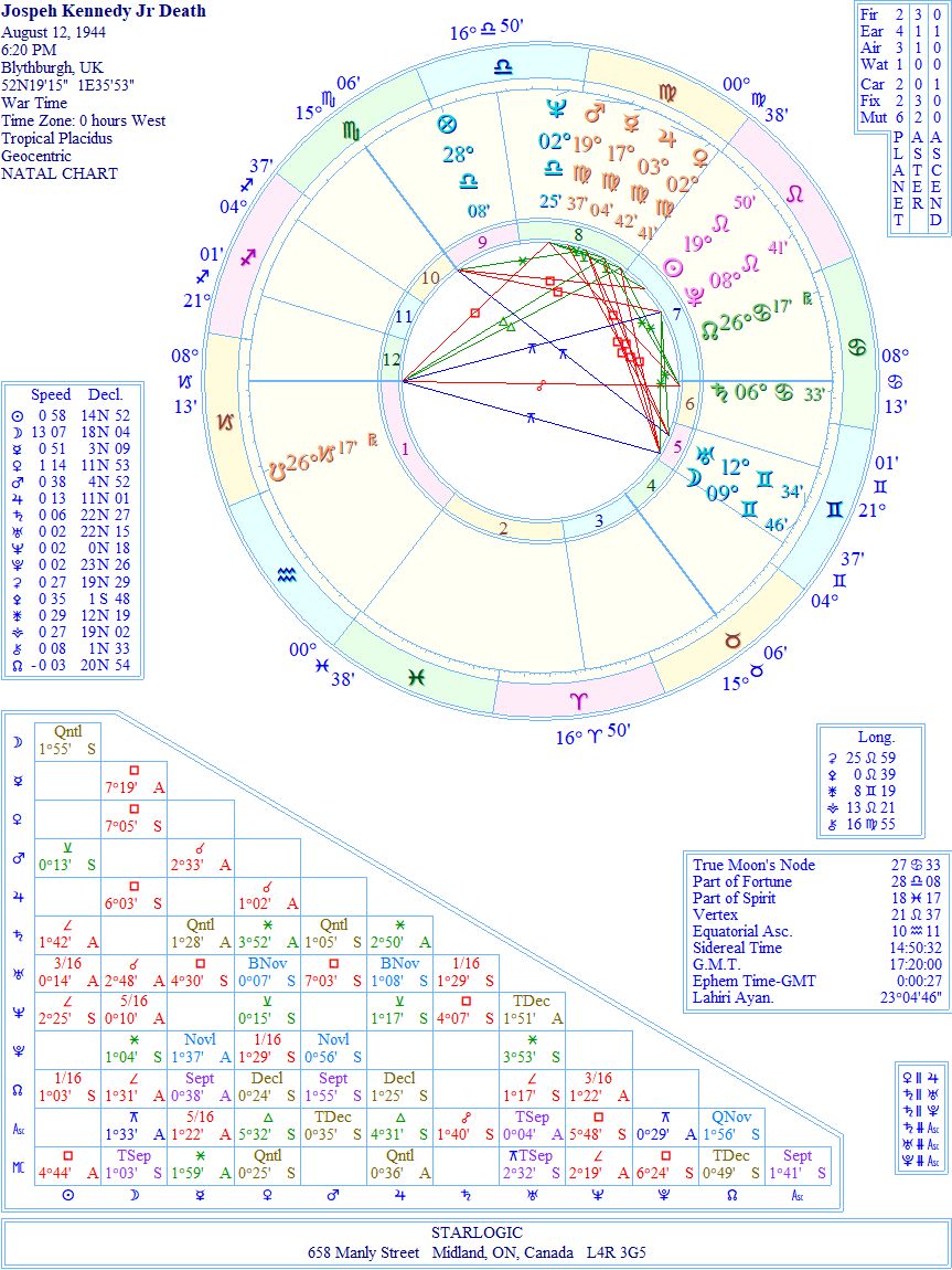 Again, his death chart shows an overload of planets in one House, this time the 8th (Death). There are three inconjuncts, one of which links the restless planet (Uranus) with the Midheaven. The other two form a Yod pointing at the Ascendant (from the Moon and Pluto). That’s why I think his death was fated.