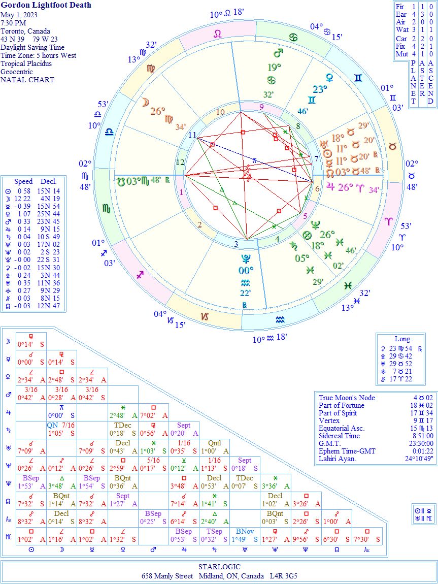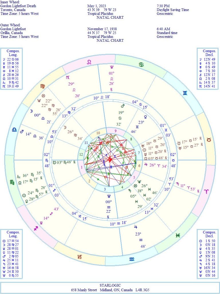 After all this time, the ‘last Gord’ has played his last chord. It’s interesting that I’m looking at yet another ‘final’ Moon inconjunct Jupiter. Talk about synchronicity. The South Node transiting a Scorpio Ascendant is a signal of his next life. Pluto is at the Nadir. This looks like an appropriate time to leave.