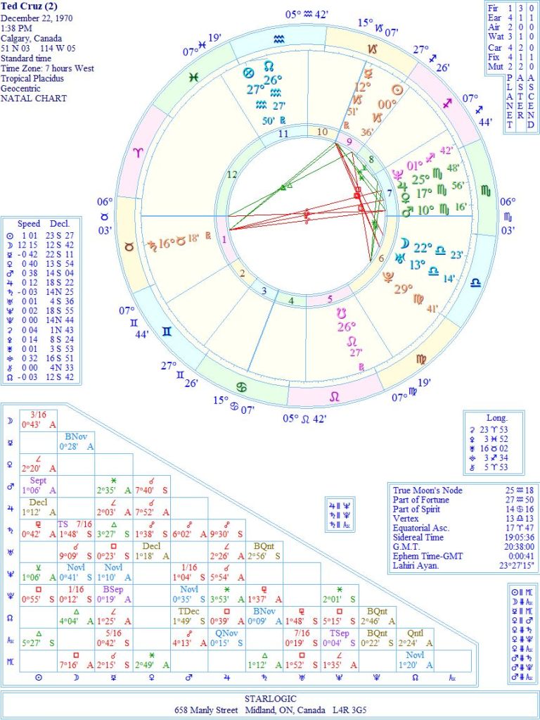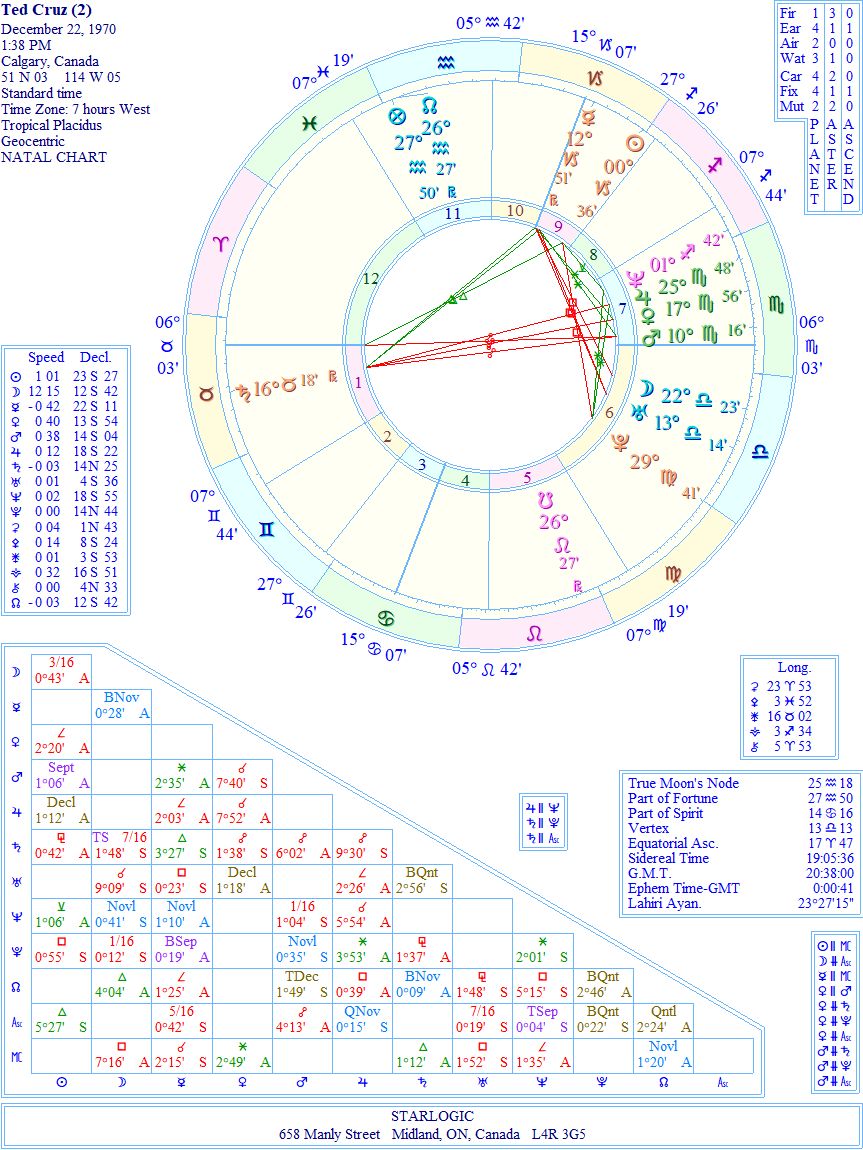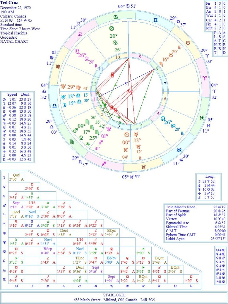 Honestly, I feel a little embarrassed that this man was born in Canada. Although he renounced his Canadian citizenship in 2014, Texas citizens (who obviously don’t appreciate him) still refer to him as that Canadian. Here is his birth chart as shown on several Astrology sites.