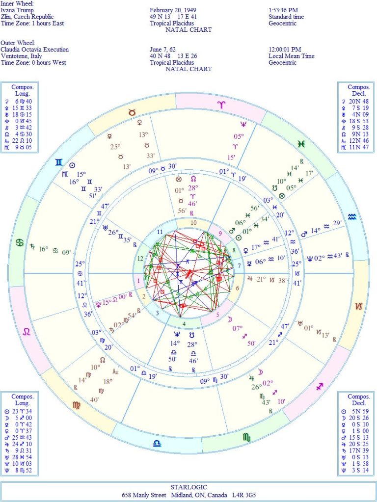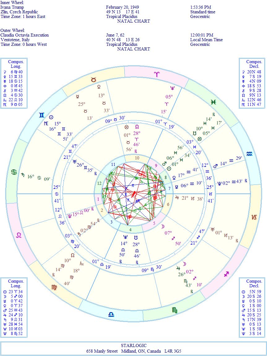 As usual, the proof is in the pudding. Claudia Octavia’s ‘fatal’ South Node/Part of Fortune conjunction is conjunct Ivana’s Sun/Mars conjunction in Pisces. Their Moons are within 6° in Sagittarius. Their positions of Uranus are opposite. Ivana’s Neptune is inconjunct Claudia Octavia’s ‘fatal’ Venus. Ivana’s Venus is conjunct Claudia Octavia’s ‘fatal’ Mars and inconjunct to her ‘fatal’ Saturn. That makes her relationship to the Donald feel fated. Claudia Octavia’s ‘fatal’ Pluto is within 5° of Ivana’s Mercury.