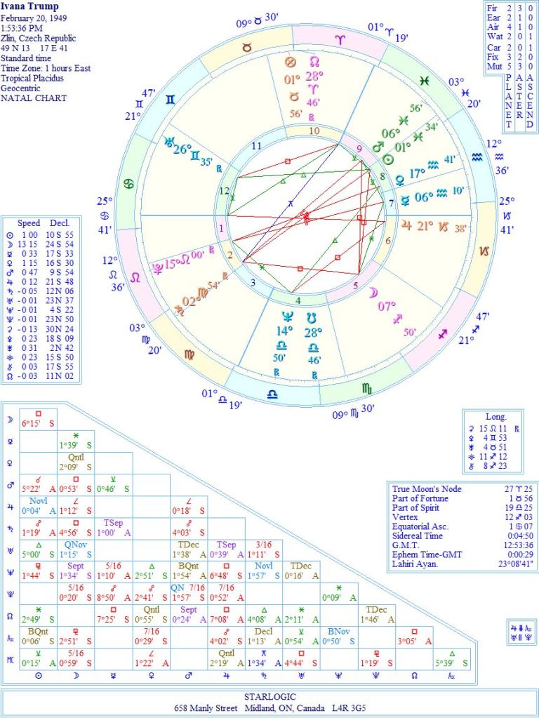 As I randomized Ivana’s birth time, I wouldn’t set too much store on the only (time-related) inconjunct between Saturn and the Midheaven. But it does make one think, doesn’t it?