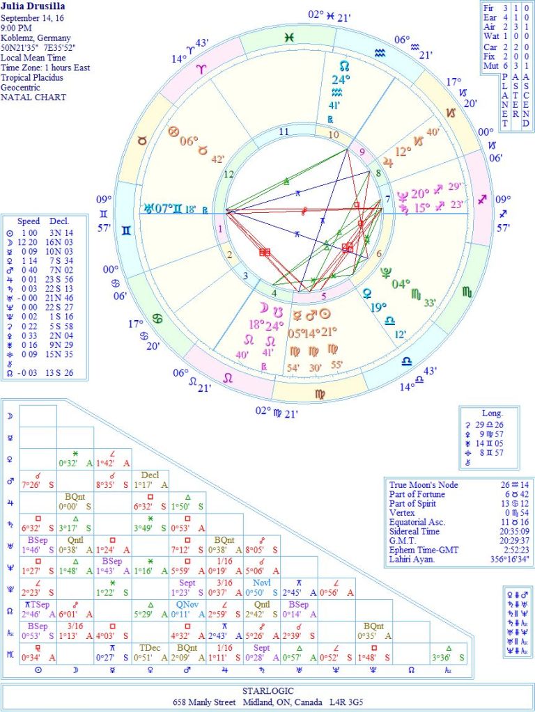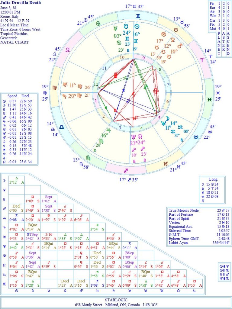 Her death chart is set for noon, but I’ll bet it was in the middle of the night, instead. However, 12 o’clock yields an interesting conjunction between the Moon and Neptune, both inconjunct to Uranus. At the same time, the Sun is inconjunct Jupiter. This may be important later.