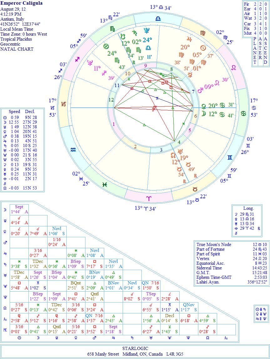 Now this is going to be a stretch of the imagination. Since I’ve written about Adolf Hitler before, we have already seen his birth and death charts. Therefore, it won’t be difficult to compare him to Caligula.