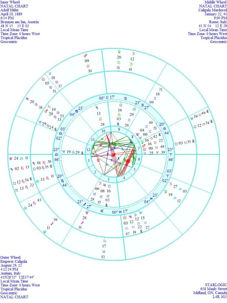 So, not such a silly idea, after all. (Accidently) Hitler’s South Node is conjunct Caligula’s natal Ascendant. And Caligula’s ‘fatal’ South Node is conjunct Hitler’s Sun. Even Caligula’s natal North Node is within 4° of Hitler’s Venus/Mars conjunction in Taurus. Meanwhile, Hitler’s North Node is midway between Caligula’s natal Moon/Venus conjunction in Cancer. And, finally, Hitler’s Ascendant is conjunct Caligula’s natal Pluto. Do you need any further proof?