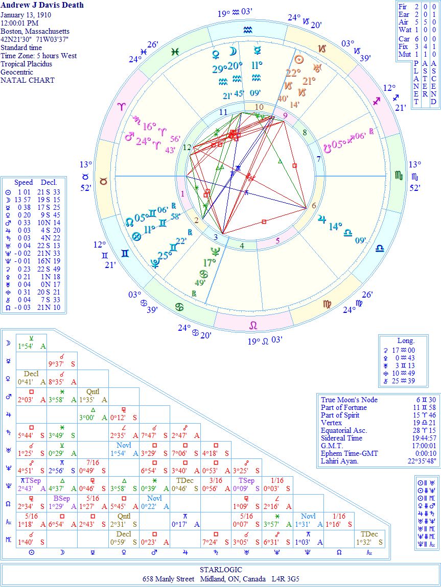 For the longest while I couldn’t find where he died, until I Googled that question specifically: the answer was Boston. The noon-time death is for convenience, and there are four inconjuncts: a double one links the Sun/Midheaven conjunction with Pluto; the next links Jupiter and the Ascendant, and the last links (surprise, surprise!) the Moon and Neptune. That means that only the inconjunct between the Sun and Pluto is fully reliable, demonstrating that his death was affected by a deep psychological force. Hmm.
