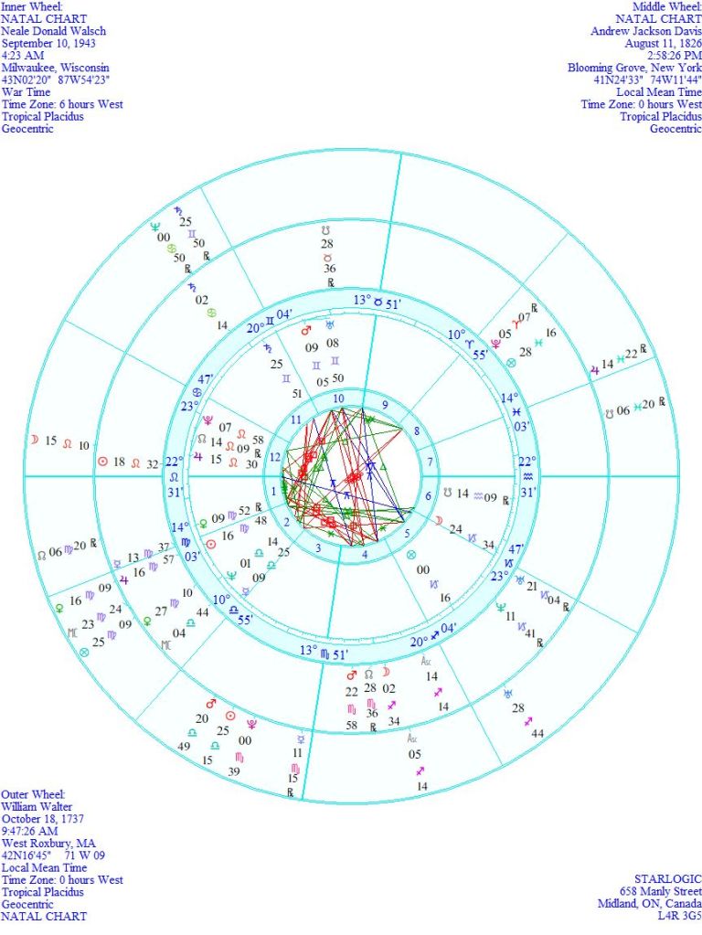 There are some very obvious links between these three charts. They have mostly to do with Davis’ death chart and Walsch’s birth chart. I thought that strange. Especially that conjunction between Walsch’s Saturn and Davis’ ‘fatal’ Pluto, and Walsch’s Moon and Davis’ ‘fatal’ Sun but it makes sense, if you think about it. Because Walsch’s Sun is conjunct Davis’ Jupiter, the whole unfolding Universe is on display.