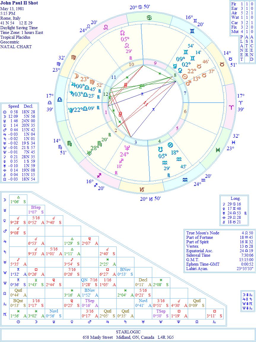 The Assassination Attempt’s Mars is conjunct the Fatima Secrets’ Moon (in Taurus). At the same time the Assassination Attempt’s Venus is conjunct the Fatima Secrets’ Jupiter (in Gemini). And the Midheaven in the Assassination Attempt’s chart is conjunct the Sun in the Fatima Secrets’ chart @ 2o° Cancer. Even Neptune in the Fatima Secret’s chart is connected to the North Node in the Assassination Attempt’s chart. But is that enough proof? No, I think it requires the ‘hidden’ hand, as it were: